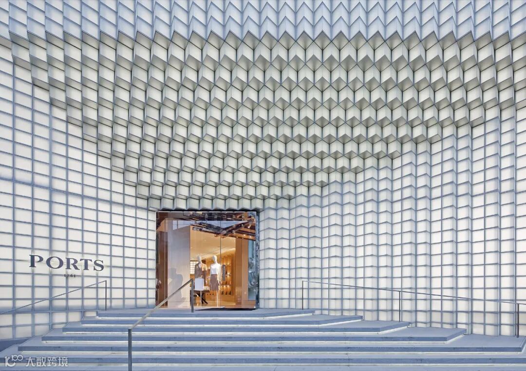 PORTS 1961 上海旗舰店,立面不同于大多数玻璃砖砌体结构,它不局限于一个垂直平面,而是由两种玻璃块面组成: