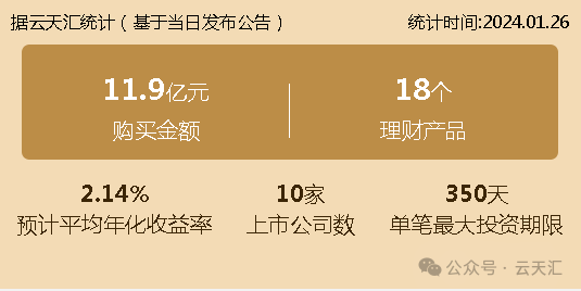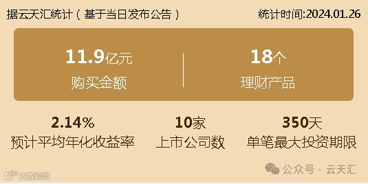 2024年01月26日,上市公司购买理财金额11.9亿元,共10家上市公司,理财产品18个,单笔最大投资期限350天。