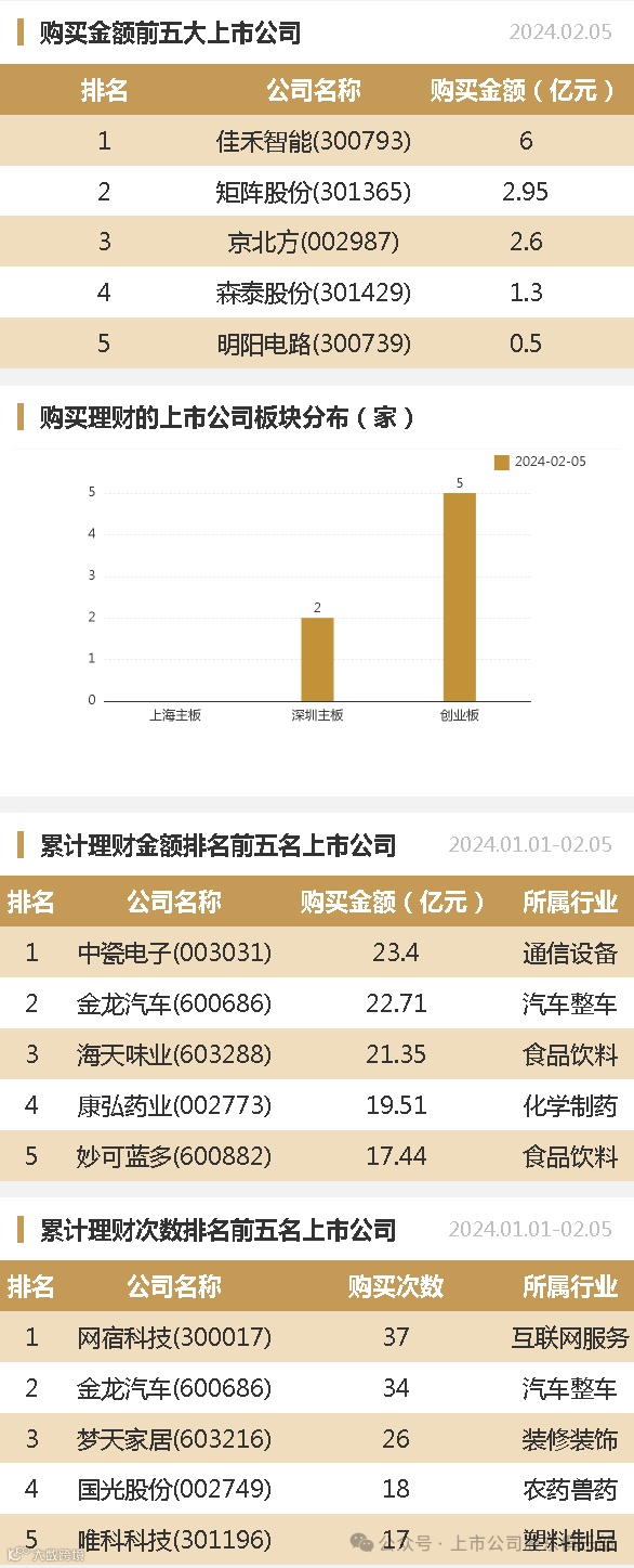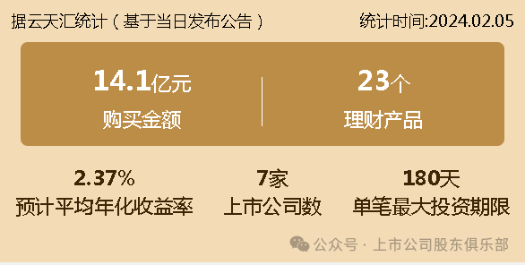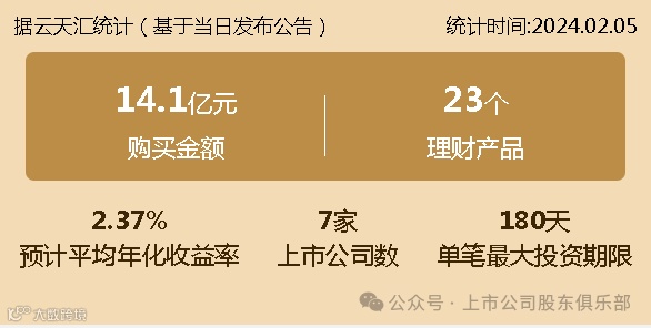 2024年02月05日,上市公司购买理财金额14.1亿元,共7家上市公司,理财产品23个,单笔最大投资期限180天。