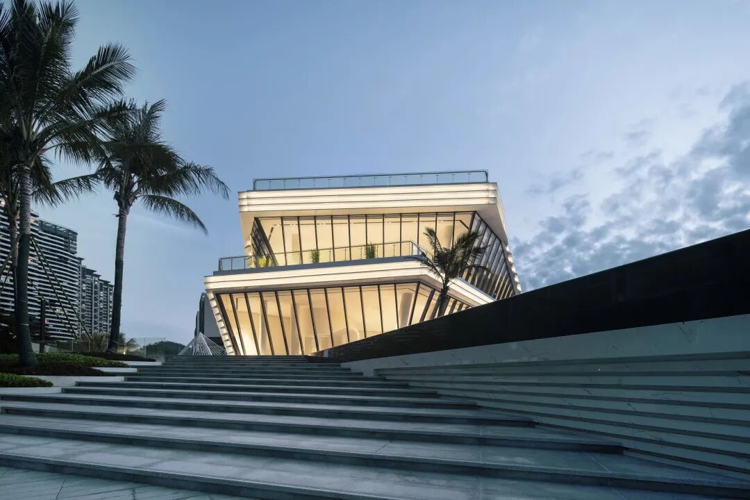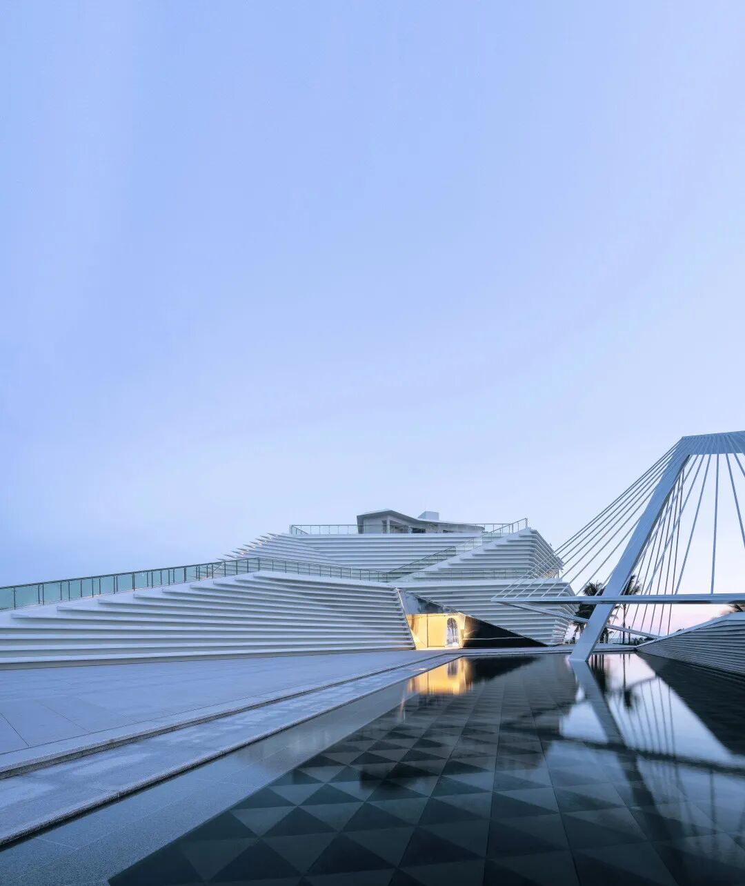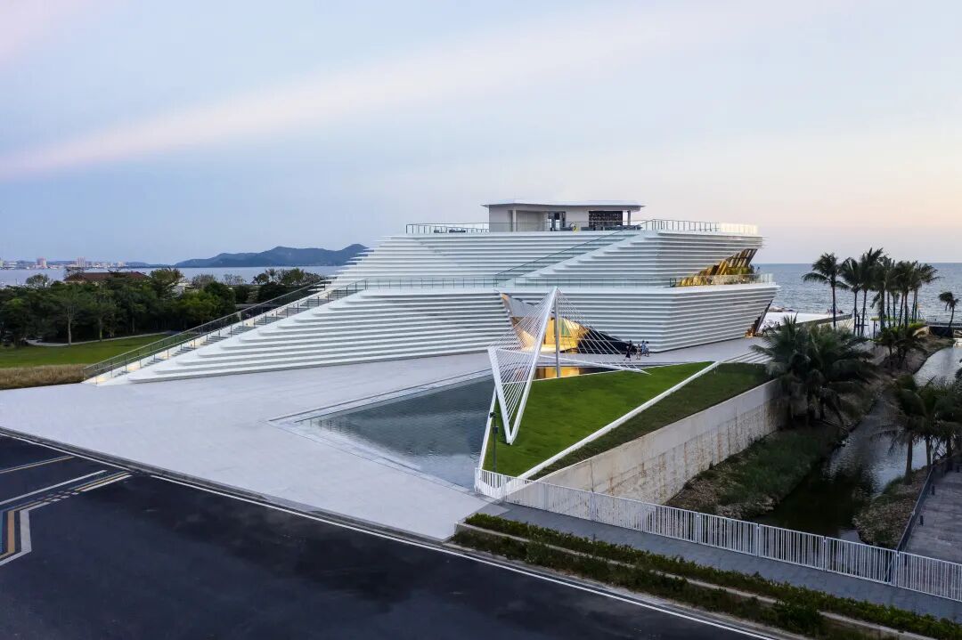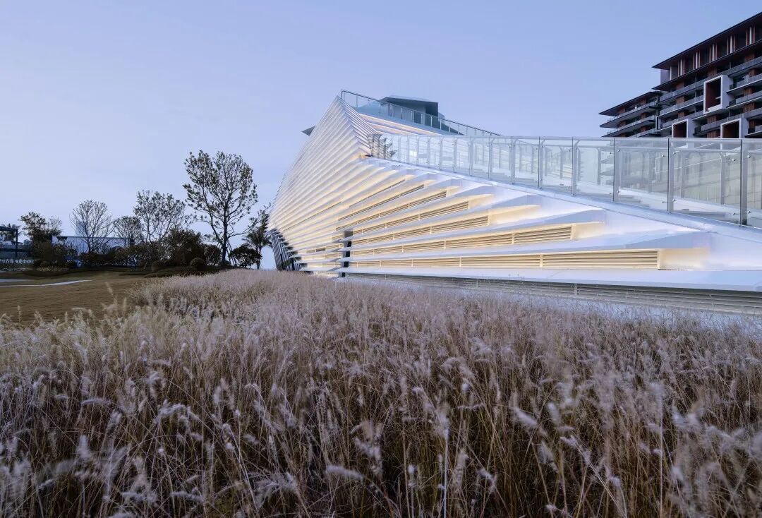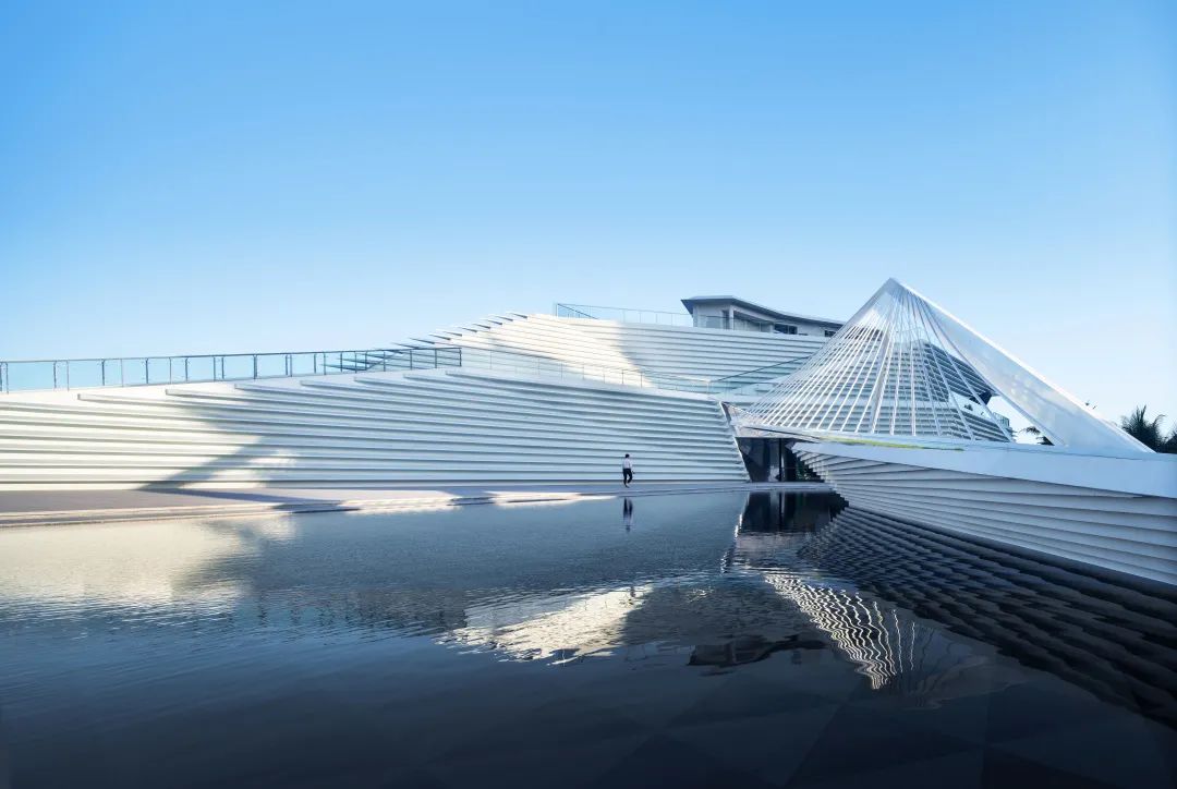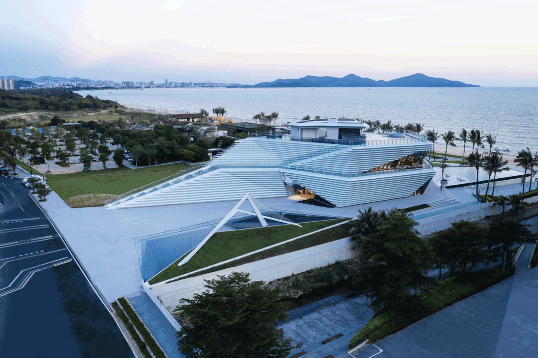建筑师一方面在形体上弱化建筑感,另一方面在建筑的外立面处理上着力于弱化与自然的边界感,在周边建筑玻璃幕墙组成的深色背景中选择层叠的耀眼白色线条实现建筑与蓝天大海的相互叠合渗透,来擦除建筑与环境鲜明的分界线。