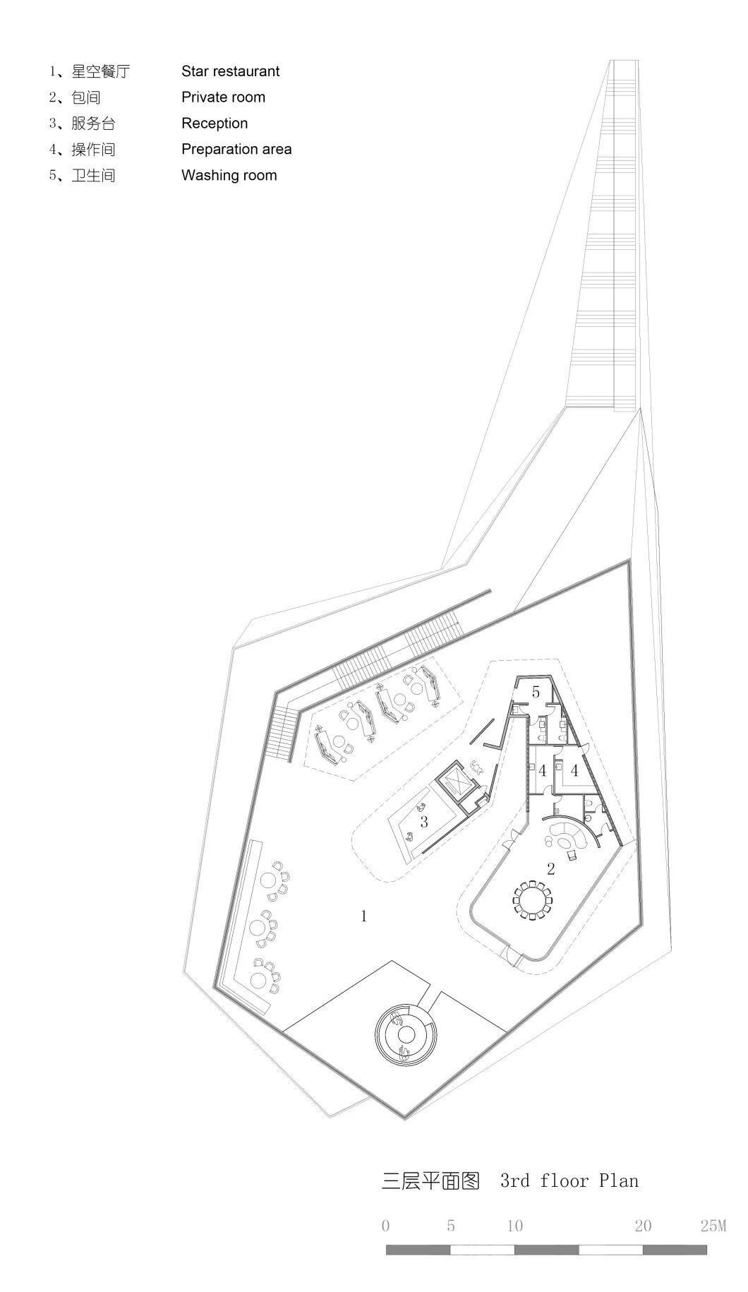 螺旋楼梯上到二层为270度海景餐厅,游客可在阵阵涛声中享受粤东地区闻名全国的特色美食。顶层露台上的星空餐厅保留了功能的可变性,为游客以及市民进行聚会休闲提供了一个绝佳的公共空间。