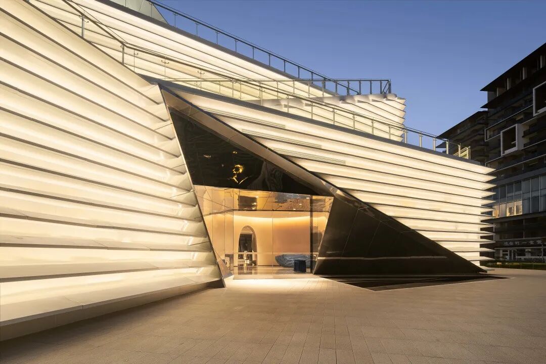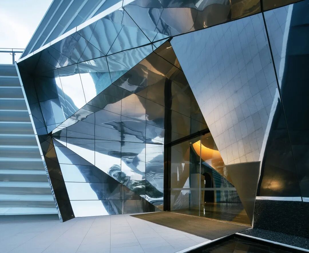 建筑主入口利用镜面不锈钢进行包裹处理,周围水景投射其中,形成海面般的波光荡漾。外立面不只是对建筑的维护,也是和环境进行对话的媒介。