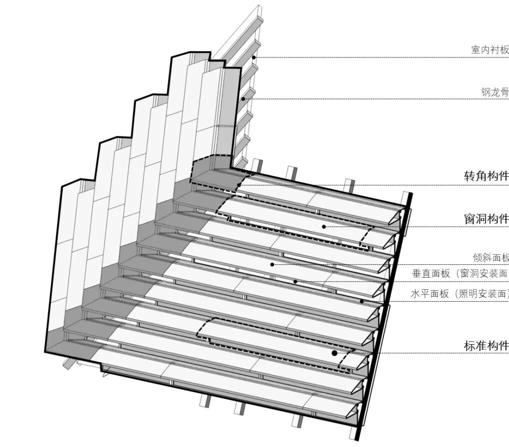土建优化同时对建筑表皮的模块化设计安装进行了研究,从白色砂岩,玻璃纤维增强混凝土,白色铝板之间进行选择,选择了工期最短、加工难度相对较低的白色铝板。