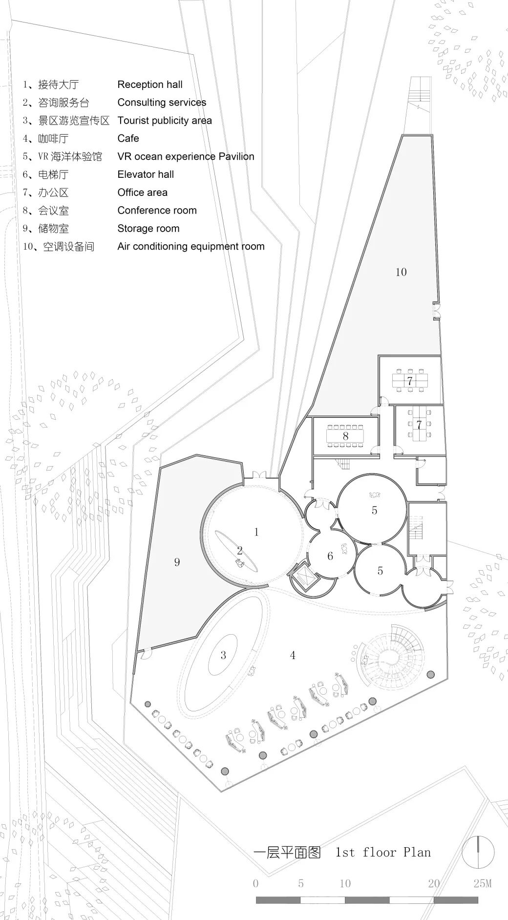 由广场进入游客中心一层,经过接待圆厅后,豁然开朗的是被海洋包裹下的综合服务大厅,其中包含咖啡厅、纪念品销售、宣传展示等功能。侧边多组气泡空间组成的海洋体验馆则用AR、全息投影等技术沉浸式的展现海洋文化。