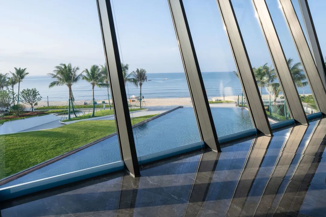 在优化阶段,使用BMI技术对复杂形体建筑的图纸进行校对。主要空间利用密肋梁优化为大跨无柱空间结合大玻璃面保障了最佳的观海效果。