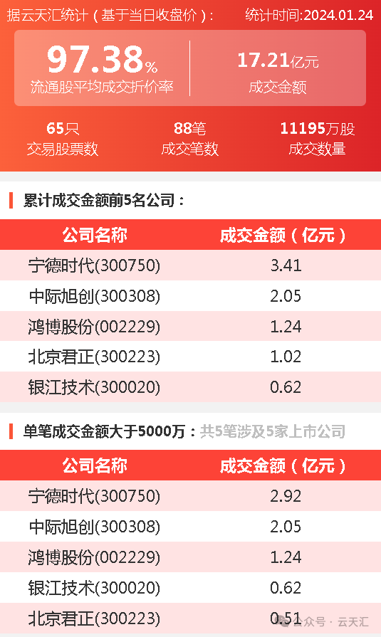 2024年1月24日,大宗交易成交金额17.21亿元,交易股票数65只,成交笔数88笔,流通股平均成交折价率97.38%,成交数量1.12亿股。