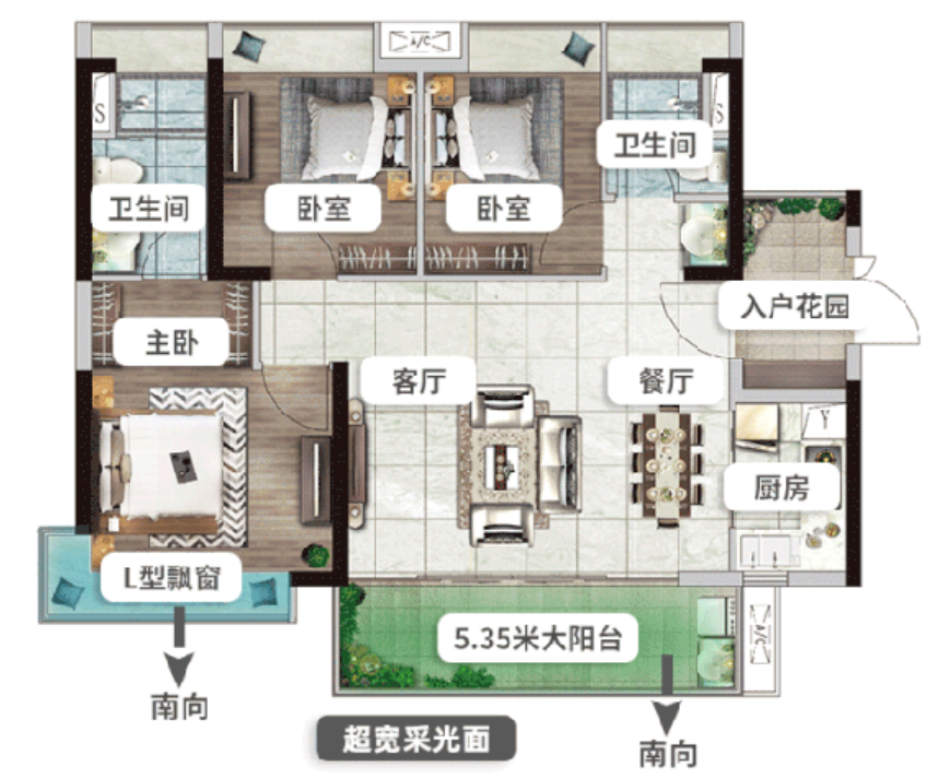70-80平米别看面积不大,在这个发挥空间有限的面积段里,光和城项目体现了足够的产品力,入门级79㎡,竟然在这个面积段里做到了三开间朝南,并且每个房间都是全明的,优势非常突出。