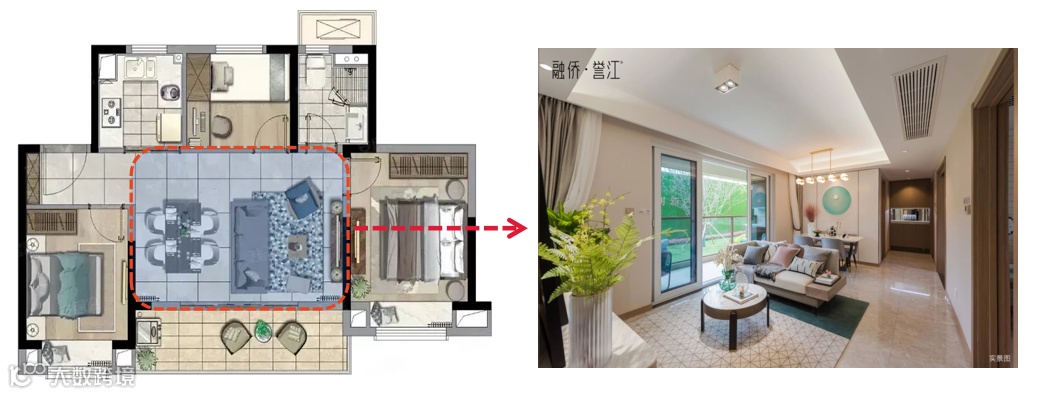 5.5米横厅连接同面宽的阳台的设计在市面上常见的刚需户型里是比较罕见的,这也是项目的一大亮点。