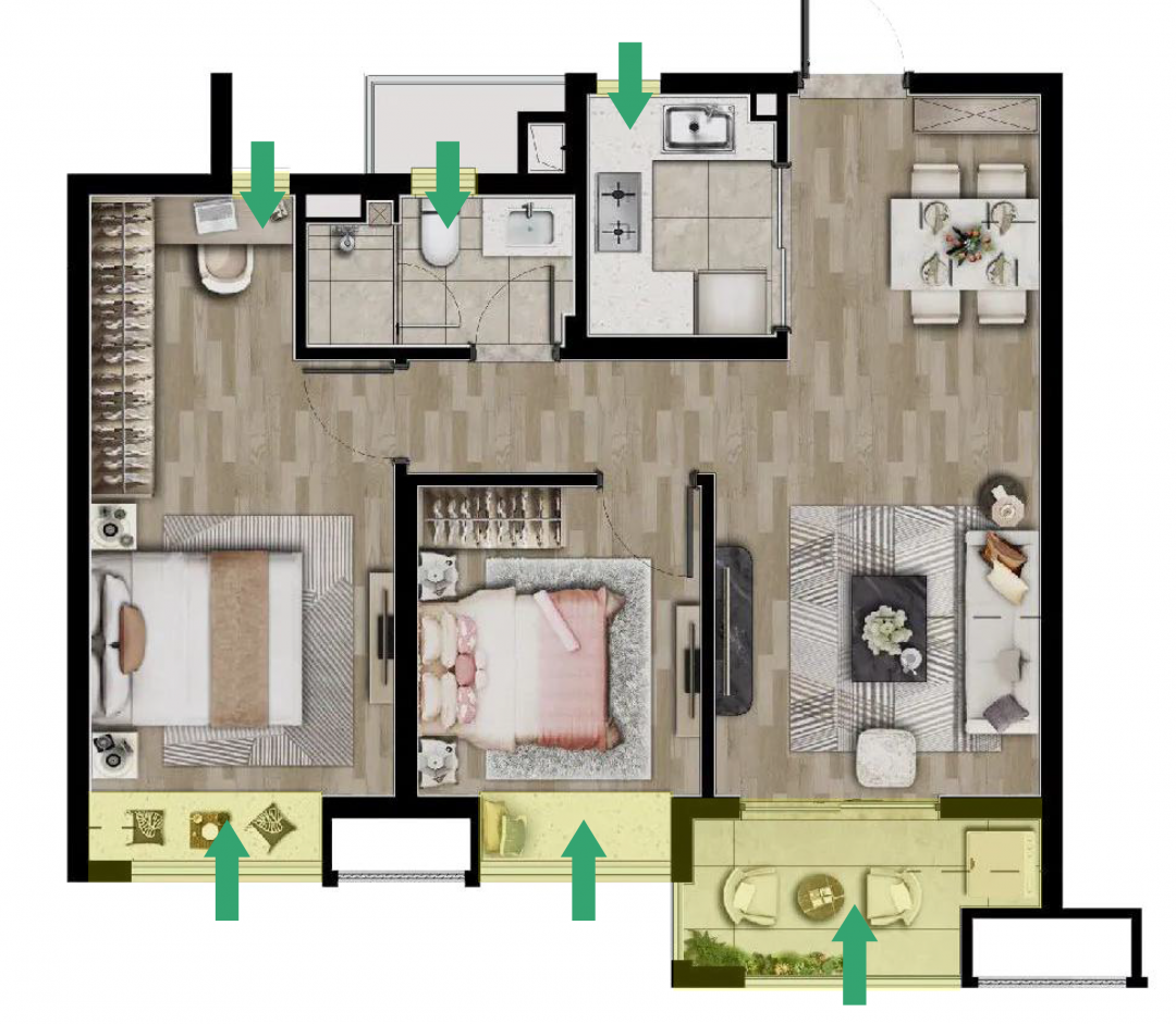 近9米的大面宽,分配给阳台和两个飘窗,让阳光肆意倾泻入室内的每一个角落。采光和通风堪称MAX级别。