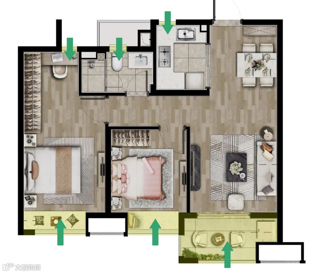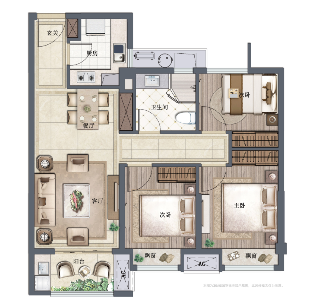 小细节也十分到位,客厅带独立阳台,餐厅带玄关柜,主卧带全明梳妆间和飘窗,次卧也带飘窗……
