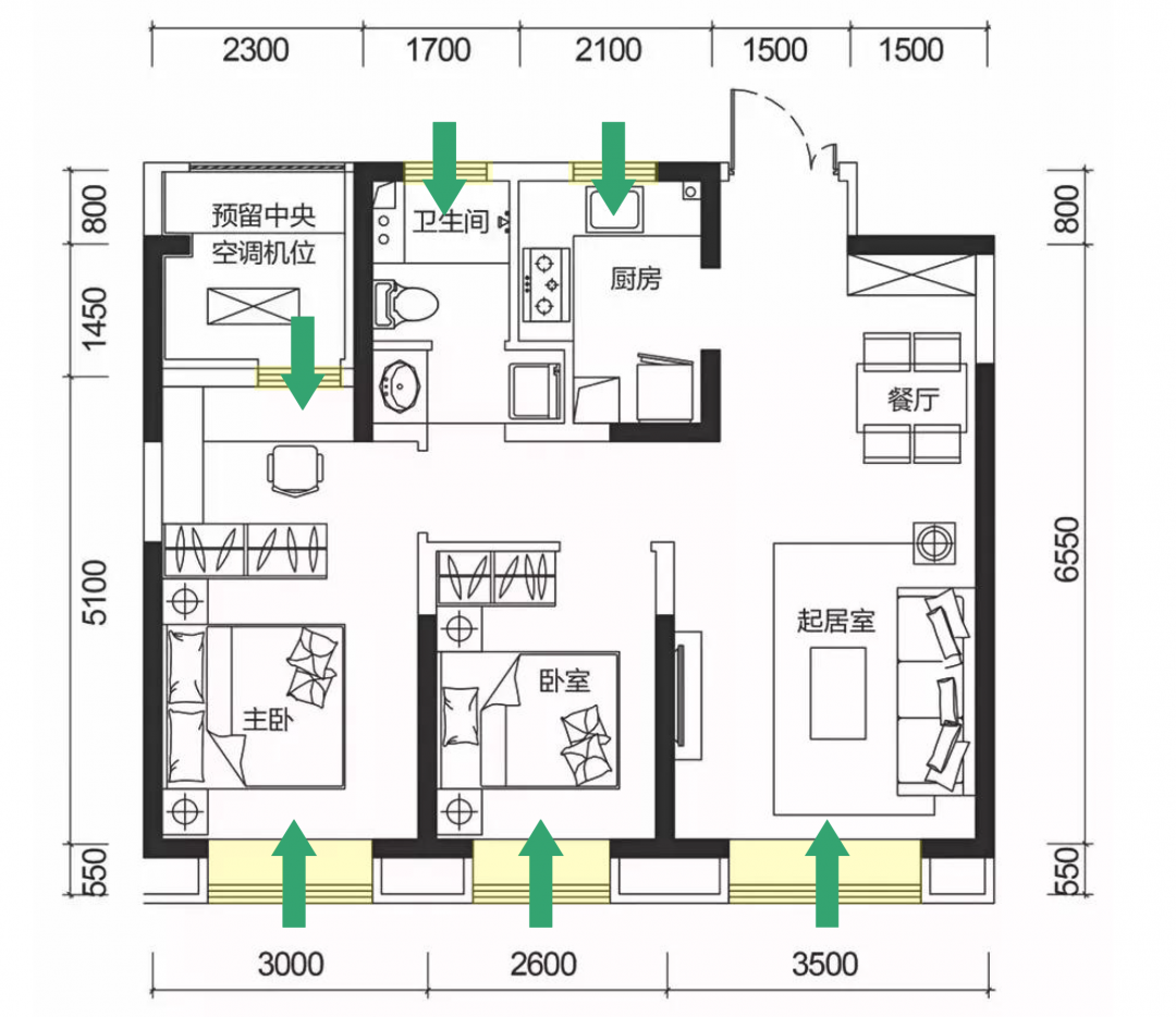 上海万科启宸,98平米的小三房的客餐厅开窗大到5.6米,采光效果非常好。