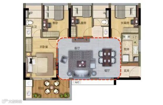 广州万科95㎡四房,这个户型的亮点还是万科的大横厅设计,而且南北对流。