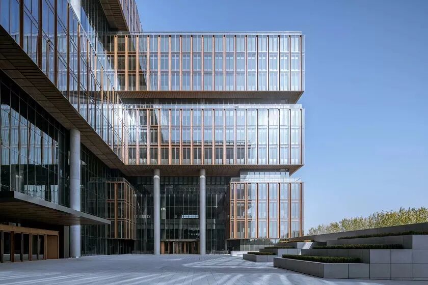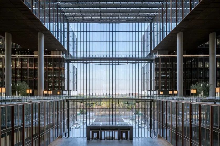 九个庭院的布局确保了在给定容积内的有效空间使用,另外,工作环境的通透性亦彰显了亚投行逾百个国家交互包容、开放透明的合作理念。三层高的条状体量将大型建筑物进行水平划分,间隙楼层与空中花园从蜿蜒连续的回形布局中生成,采光中庭所创造的视野关系,可以提升公共空间的开放交流性,同时还赋予了建筑简明的朝向秩序,使工作单元更加灵活。