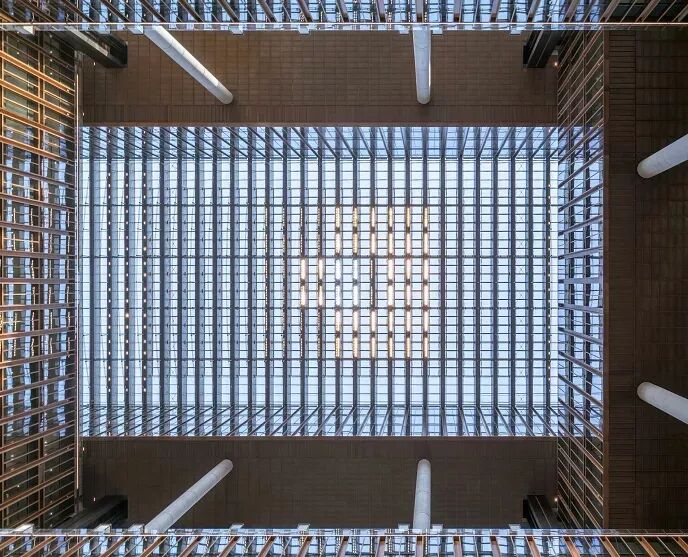 建筑采用全钢结构体系,用钢量约11万吨,运用创新的钢板剪力墙系统,16组核心筒构成全楼主要空间框架,大幅提升空间使用率。80米高的玻璃挑空大厅,使工作区能享受开阔的视野和比较均衡的自然采光,减少白天照明需求。外侧玻璃幕墙有电动遮阳板,可根据光照、温度等自动开合,及时遮阳、降低空调能耗。遮阳板上还有中国传统木窗上的格子装饰,让整栋建筑更具中国风。