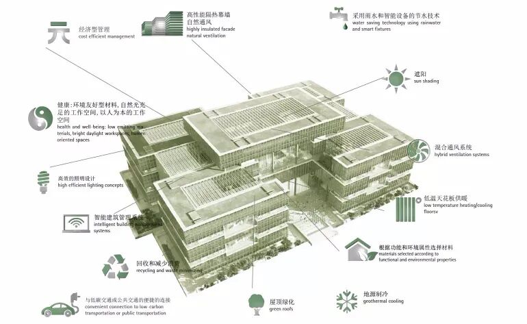 建筑地下一层、首层与二层处设有餐厅、咖啡厅……下沉式园林庭院,提升了整体环境和舒适度。实现了“楼外公园、楼内花园”的办公环境。最大限度节约资源、保护环境和减少污染,为人们提供健康、实用和高效的使用空间,并能与自然和谐共生。