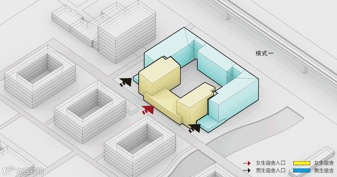 结合校园现在的男多女少的比例问题,同时考量之后变化的可能性,设置三个入口可以分别负责进入不同区域的宿舍单元,宿舍单元之间可以灵活组合便于应对今后不同需求的管理策略。