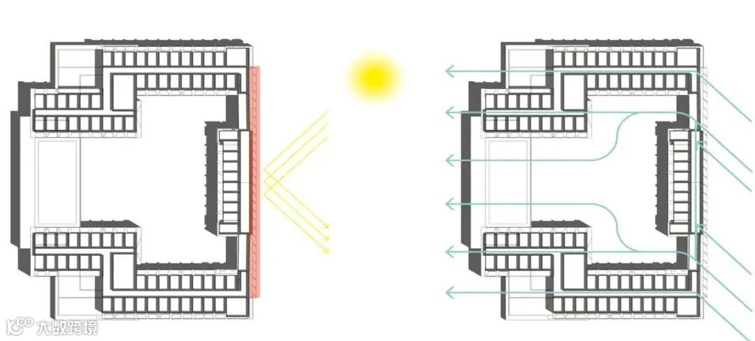 在满足业主需求的基础上,尽量减少东西向的房间设计。东侧通过折面设计阻隔,在西侧运用大进深的阳台以及合理的遮阳板布置,尽可能的给学生们带来舒适的生活环境。作为东面的走廊的遮阳构件,能减少整体建筑的东西晒影响,减少整栋楼不必要的热工性能。