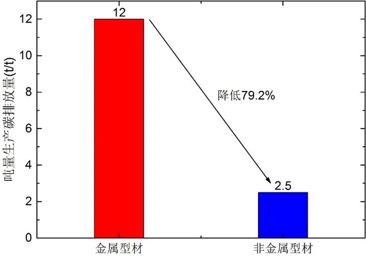 在生产过程中碳排放量更低:非金属型材生产过程中碳排放约为2.5 t/t,远低于生产金属型材的碳排放量12 t/t。