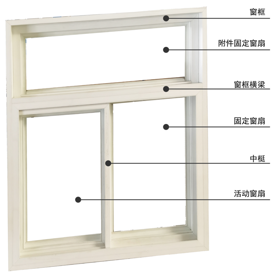 •中梃安装在窗框内以将窗框的内框分隔成固定窗口和开启窗口,固定窗扇安装于固定窗口,窗框设有滑槽,活动窗扇滑动安装于滑槽;