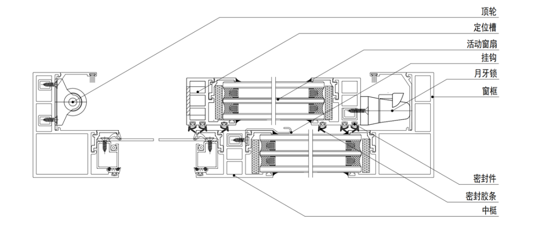 通过顶轮与定位槽配合定位,活动窗扇通过月牙锁和挂钩配合,活动窗扇受压靠紧窗框和中梃,密封件和密封胶条填充活动窗扇与窗框之间的间隙,进一步提升密封性。