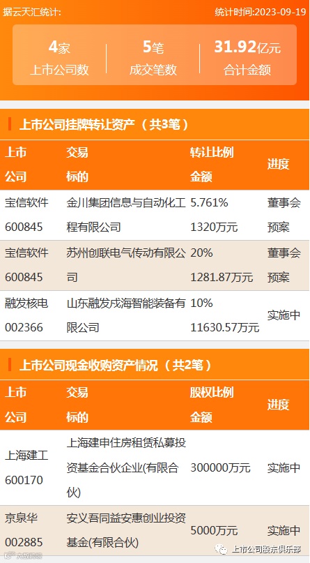2023年9月19日,资产交易成交金额31.92亿元,上市公司4家,成交5笔,上市公司挂牌转让资产3笔,现金收购资产2笔。