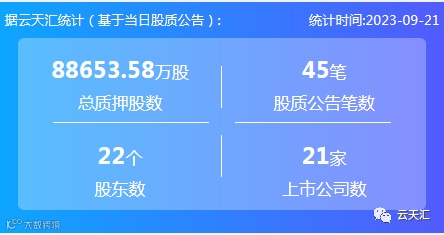 2023年9月21日,股票质押总质押股数8.8亿股,上市公司数21家,股质公告笔数45笔,股东数22个。