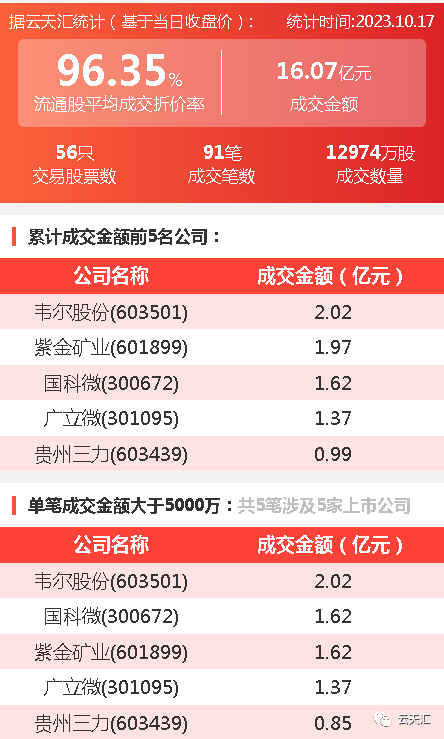 2023年10月17日,大宗交易成交金额16.07亿元,交易股票数56只,成交笔数91笔,流通股平均成交折价率96.35%,成交数量12974万股。
