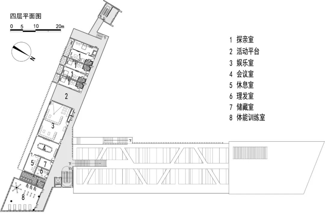 罗岗站北侧为参观出入口,市民周末和节假日参观时,通过楼电梯到达二层参观连廊,参观消防车库和车库屋顶的绿化果园,俯瞰训练场地。预约参观时,可通过一条完整流线将开放区参观完毕。封闭区与开放区连接处均设有管理口。