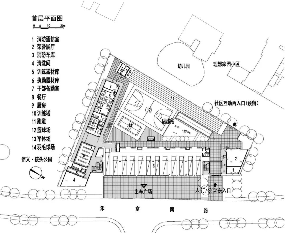 罗岗站东侧有城市道路相邻,可作为建筑主出入口。周边社区成熟、建筑拥挤,因此我们设置了抗干扰的“内向型”庭院,让建筑围绕它作L型布局。L型东侧布置消防车库出入口、门厅主入口,北端布置了展厅、公众服务区,在L型南面布置业务用房,其中一层餐厅、二层备勤室、三层活动室,内庭院有篮球场、羽毛球场、训练场,西南端设训练塔作为整个建筑的标志物。