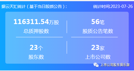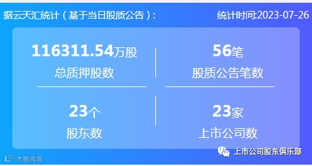 2023年7月26日,股票质押总质押股数11.63亿股,上市公司数23家,股质公告笔数56笔,股东数23个。