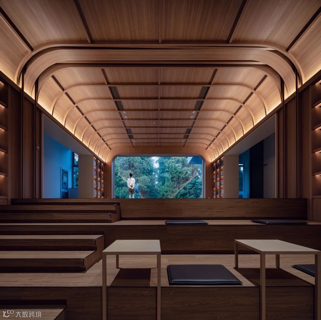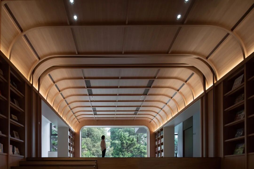 为延续书籍在这片空间中留下的温暖记忆,设计师将“图书馆”的一层与二层创造成了一个开阔、 通透、充满人文气息的挑高中庭空间,空间两侧以连续的完整的书墙来界定,书架分隔的线条 延续到天花板形成连续的拱形,强化了空间的精神性,端部则通过自然光线的引入,成为空间 中自然与人文的一种隐含沟通。