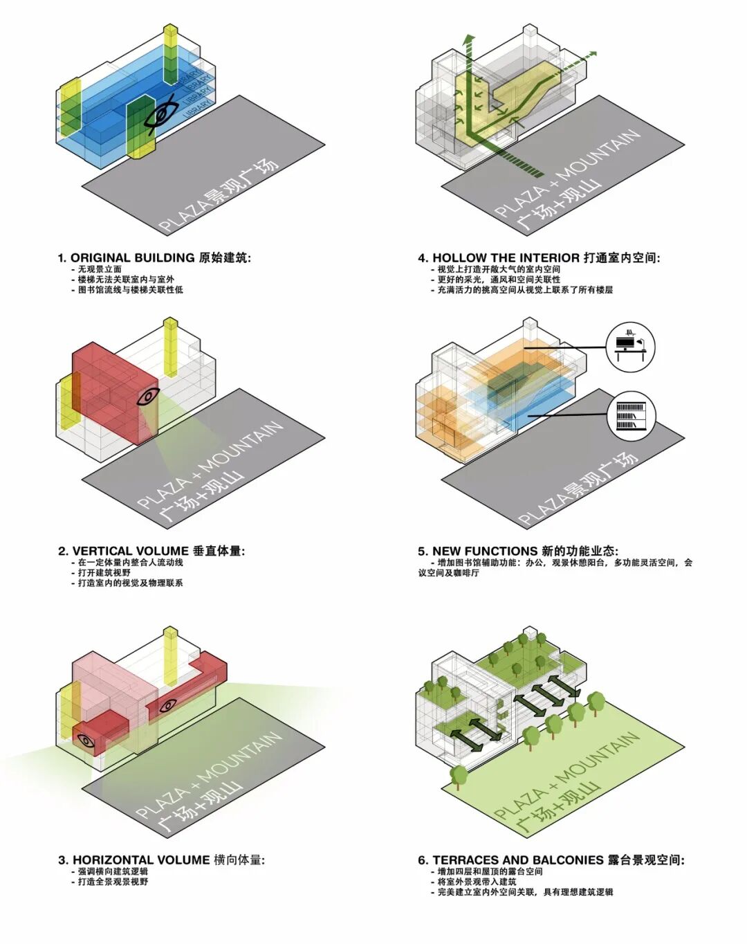 原有的图书馆功能单一,保护书籍,保持安静的读书环境使建筑空间相对封闭。设计师将原有的交通空间打造成一个高24米的公共橱窗,突出其文化的地标性。愈加开放与共享,也正体现了现代城市公共文化空间的发展方向。
