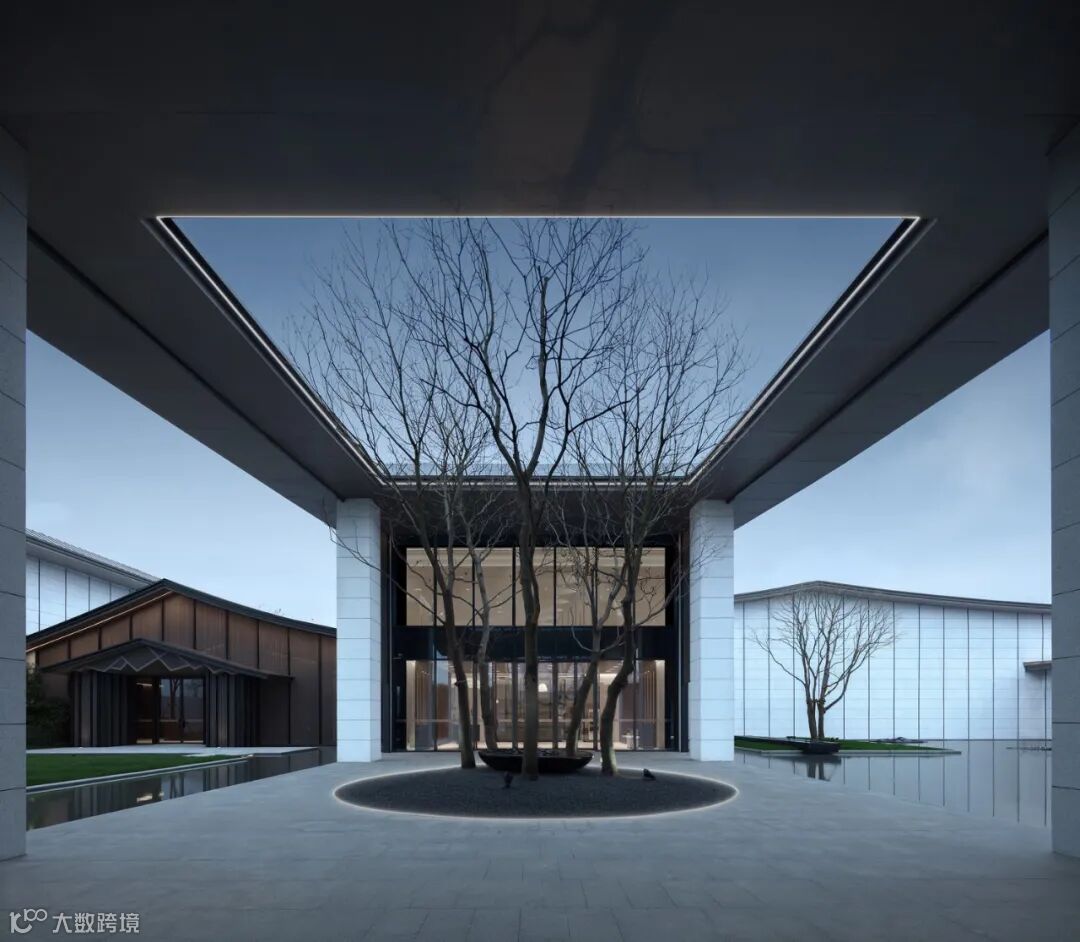 元垄·镜庐在景观设计上,以现代元素为主,融入本土文化,采用“一轴·两环·三礼八庭”的层次结构与布局,同时延续湖居的诗意生活气质。