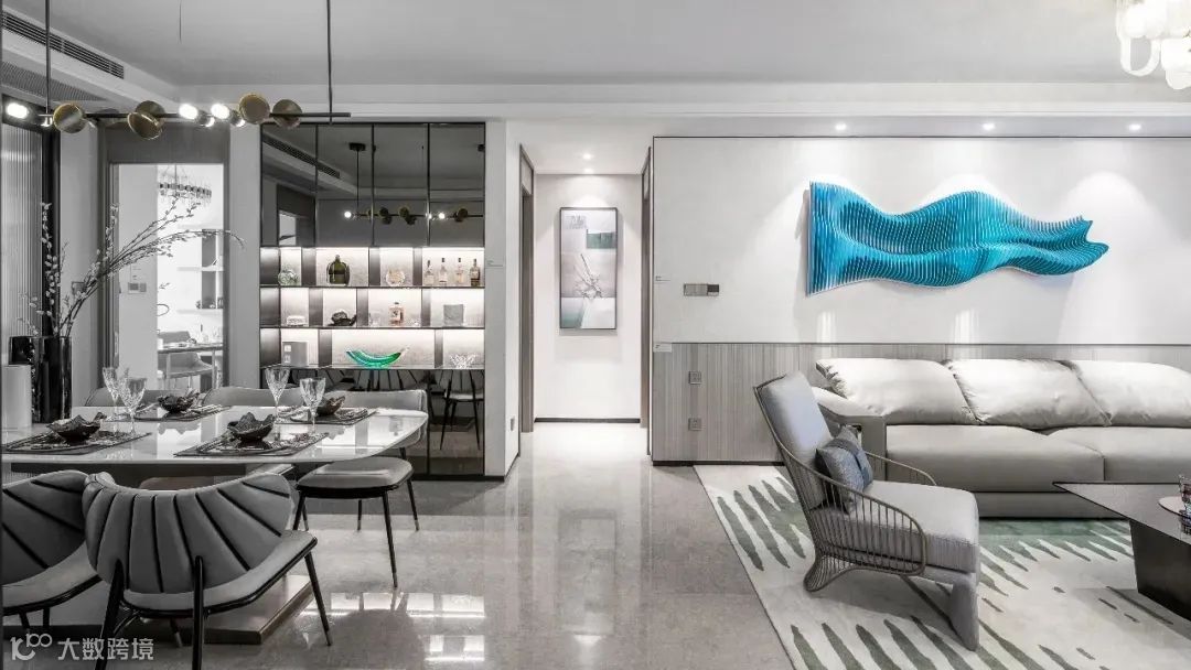 六扇倾斜而置的艺术玻璃屏风为客厅与餐厅做了隔断,其上绵延的群山间,浓淡层叠,云雾缥缈,一叶扁舟,意境悠远,仿佛一首不能自吟的无声古诗,为一层空间注入灵魂之笔。