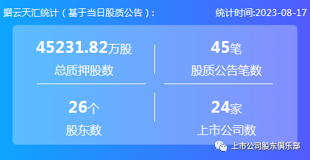 2023年8月17日,股票质押总质押股数4.52亿股,上市公司数24家,股质公告笔数45笔,股东数26个。