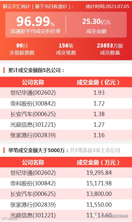 2023年7月5日,大宗交易成交金额25.30亿元,交易股票数99只,成交笔数156笔,流通股平均成交折价率96.99%,成交数量23653万股。