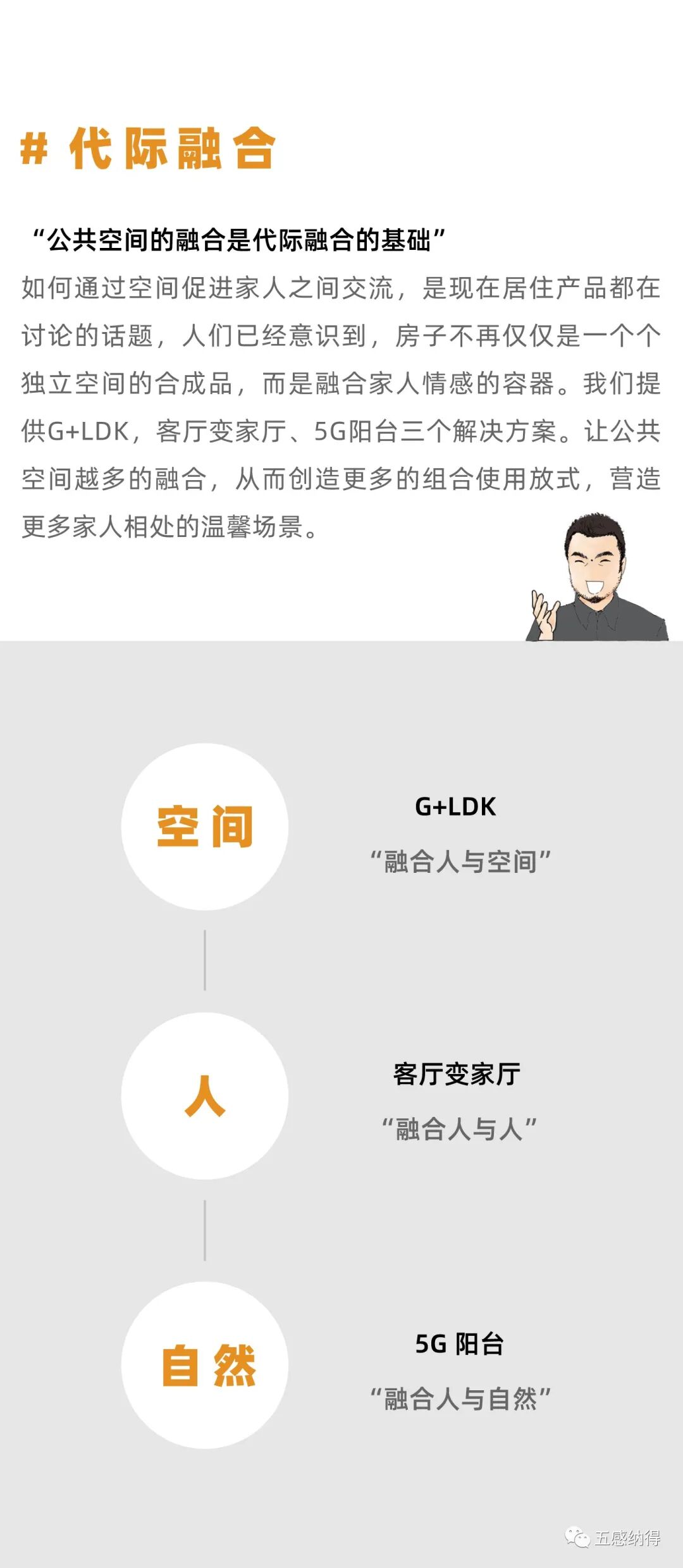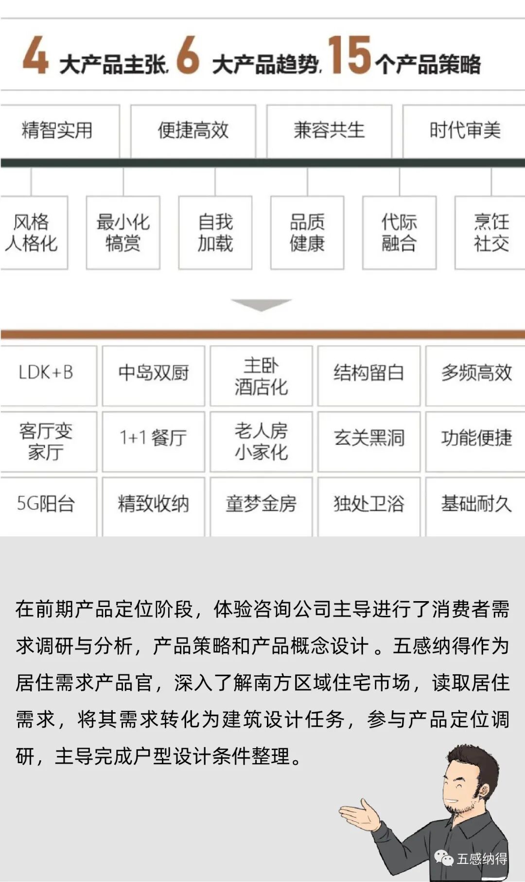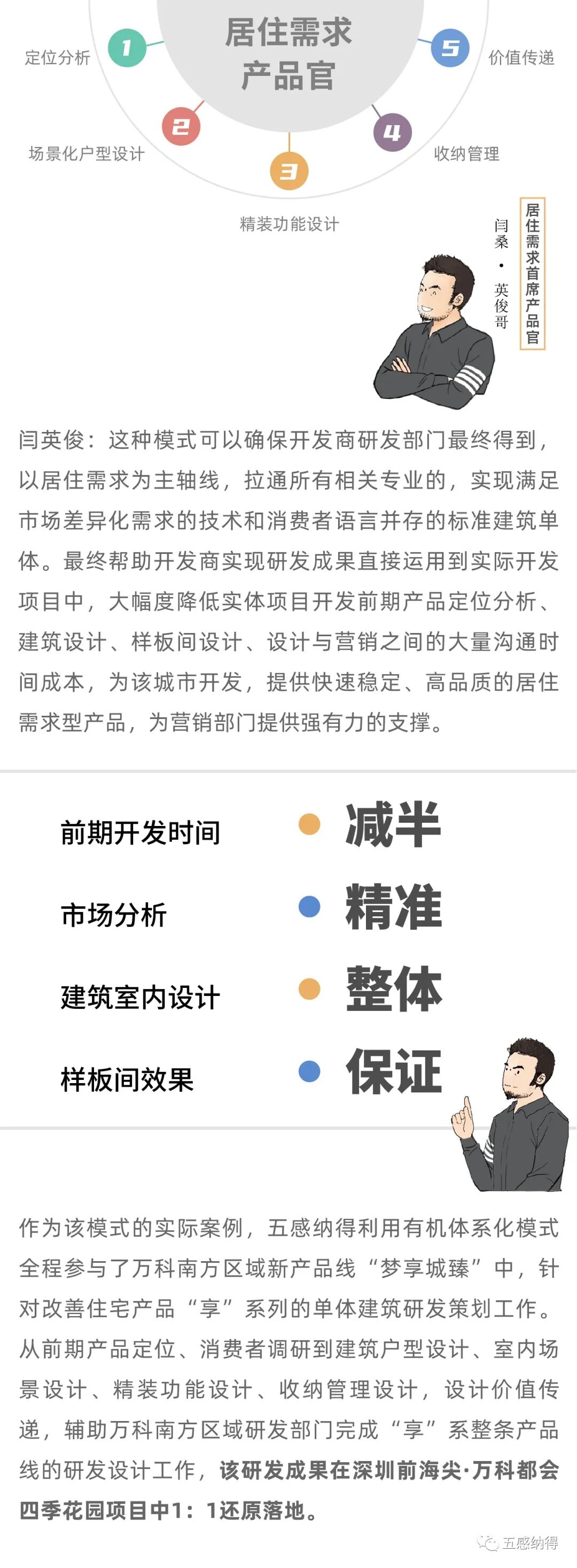 “未来”住宅产品设计:五感纳得,作为开发商与业主间的桥梁,代言业主与开发商进行对话;以居住需求为出发点,从建筑源头切入,让开发商的传统户型空间呈现更多可能性。参与融创、万科、绿城、金地、华润、远洋、华夏等开发商住宅产品线的研发和设计工作。通过住宅产品ip策划、生活场景设定、户型营造设计、收纳管理设计、体验样板间设计、产品价值传递6大流程,为开发商“未来”住宅提供全套解决方案。