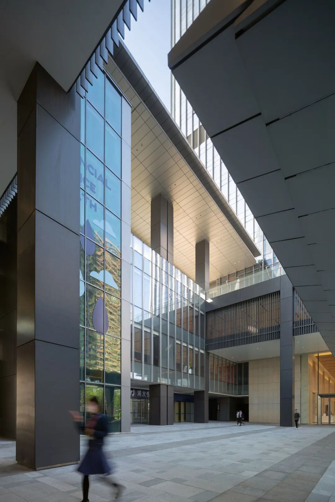 项目面对两个城市主要干道,通过富有雕塑感的优雅的塔楼群组的塑造,形成项目的门户形象,多个开敞的半户外的公共空间则方便了商务和购物人流进出项目。在流线设计上,除了和二期的人流,项目、地下车库、商业等的通盘考虑外,项目还充分利用城市现有公共交通设施,把城市人行天桥系统直接连到商业二层裙房内,与城市公共交通系统无缝接驳,并且预留了城市未来地下公共通道的接入口,城市人流可以直接到达项目最重要的核心区域。