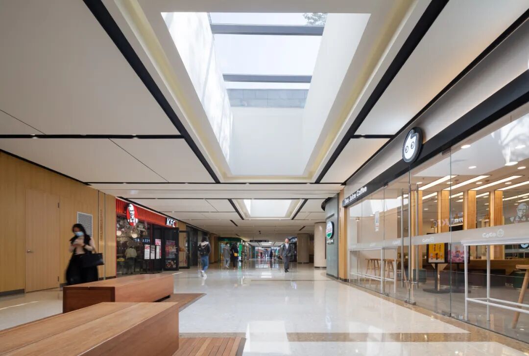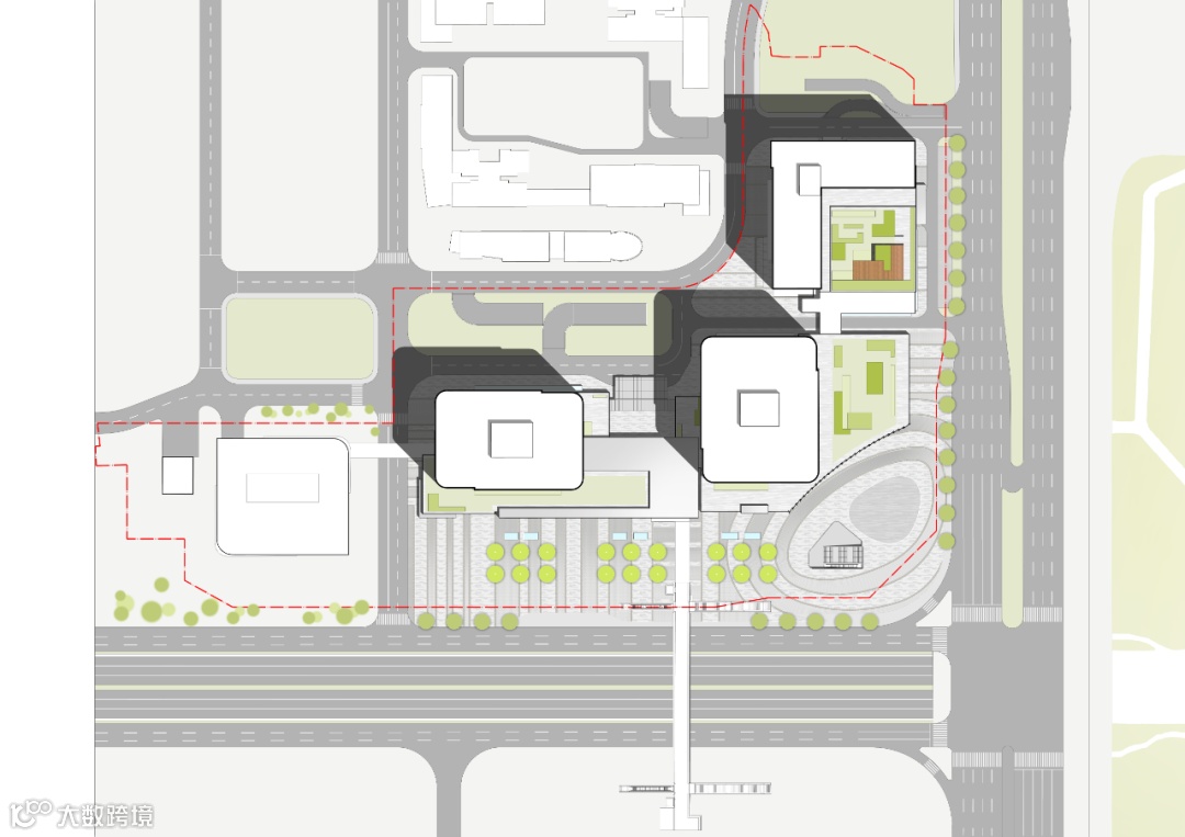 在总平面设计上,设计初始阶段就将二期的设计方案纳入总图的一部分加以设计,对地下车库及商业人流的联系、出入口进行通盘考虑,资源共享;交通上也思考如何与原有建筑进行衔接;包括对已经部分施工的工地情况进行预判,将施工的复杂性提前思考,以保证工期能够按计划顺利执行。