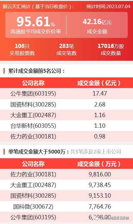 2023年7月4日,大宗交易成交金额42.16亿元,交易股票数108只,成交笔数283笔,流通股平均成交折价率95.61%,成交数量17016万股。