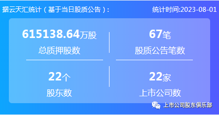 2023年8月1日,股票质押总质押股数61.5亿股,上市公司数22家,股质公告笔数67笔,股东数22个。