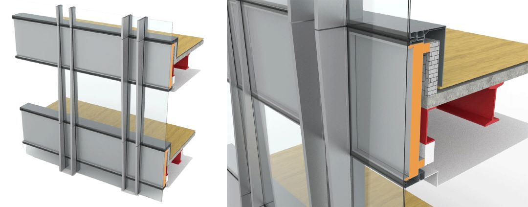 单元幕墙节点采用等压腔原理,前后腔保持压力相等,避免大量外腔的水流入内腔,从而保证幕墙的防水性能,单元结构采用横滑结构,有效吸收结构变形。