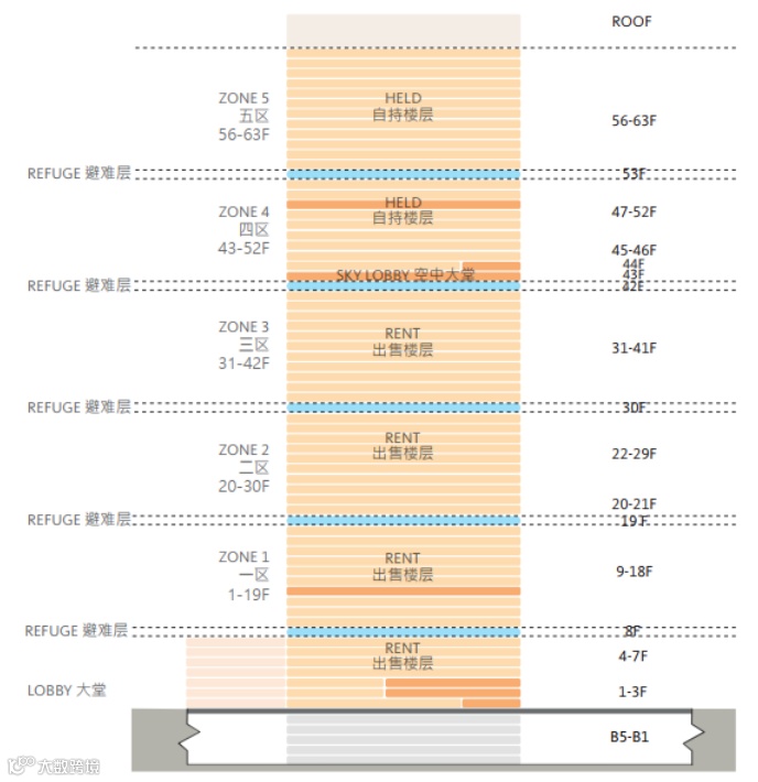 华润大厦采用矩形体量,功能布置由垂直方向划分,地上63层,地下5层,分为5个区域,由下至上布置出售办公空间和租赁办公空间,于43层空中大堂转换,以保证各类功能交通的独立性与经济性。