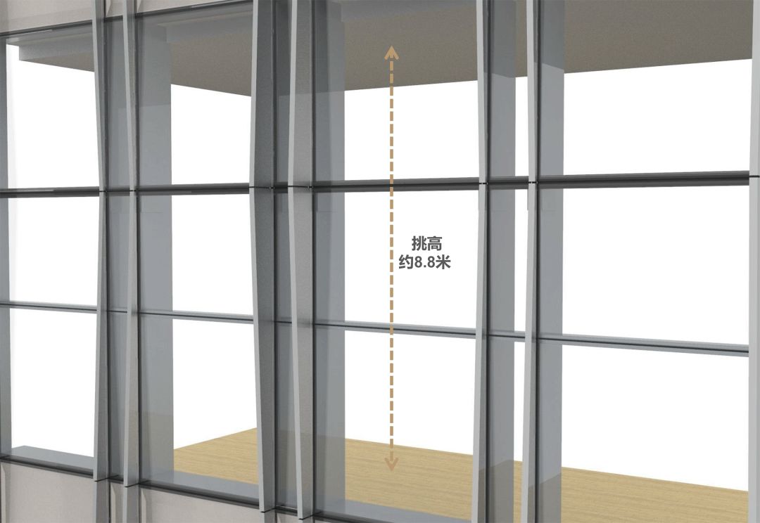 空中大堂是两层通高的空间,挑空高度约8.8米,处于塔楼高区,视野更为开阔的位置,使用钢框架幕墙来实现大层间结构要求,钢框外包铝合金型材,控制型材的外形尺寸,实现与其他楼层统一的效果,呈现高贵质感的同时保证大堂的通透性,使室内景观视野更大化。