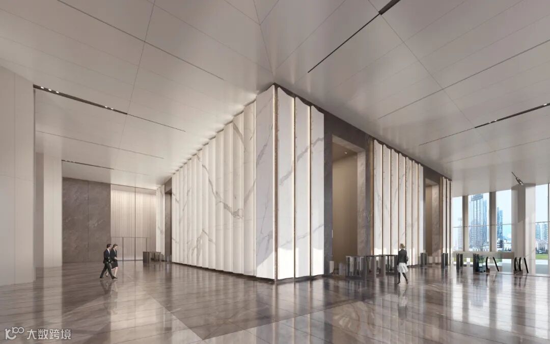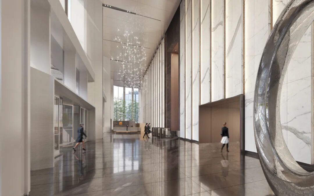 为配合建筑的外形气质,在大堂设计当中延续建筑的元素,将建筑精神融入到室内设计当中,首层大堂约17.2米、二层大堂约11.2米,室内室外成为一体化设计。