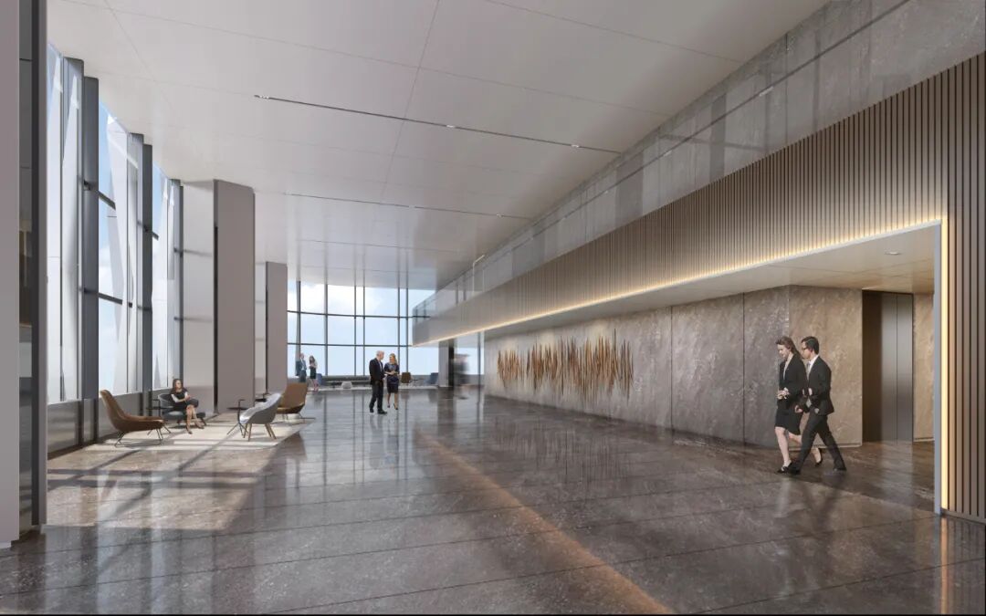 空中大堂双层挑空约8.4米,给高区用户良好的效率感及使用感,空间设计延续首层大堂设计语言,使整个空中大堂熠熠生辉。
