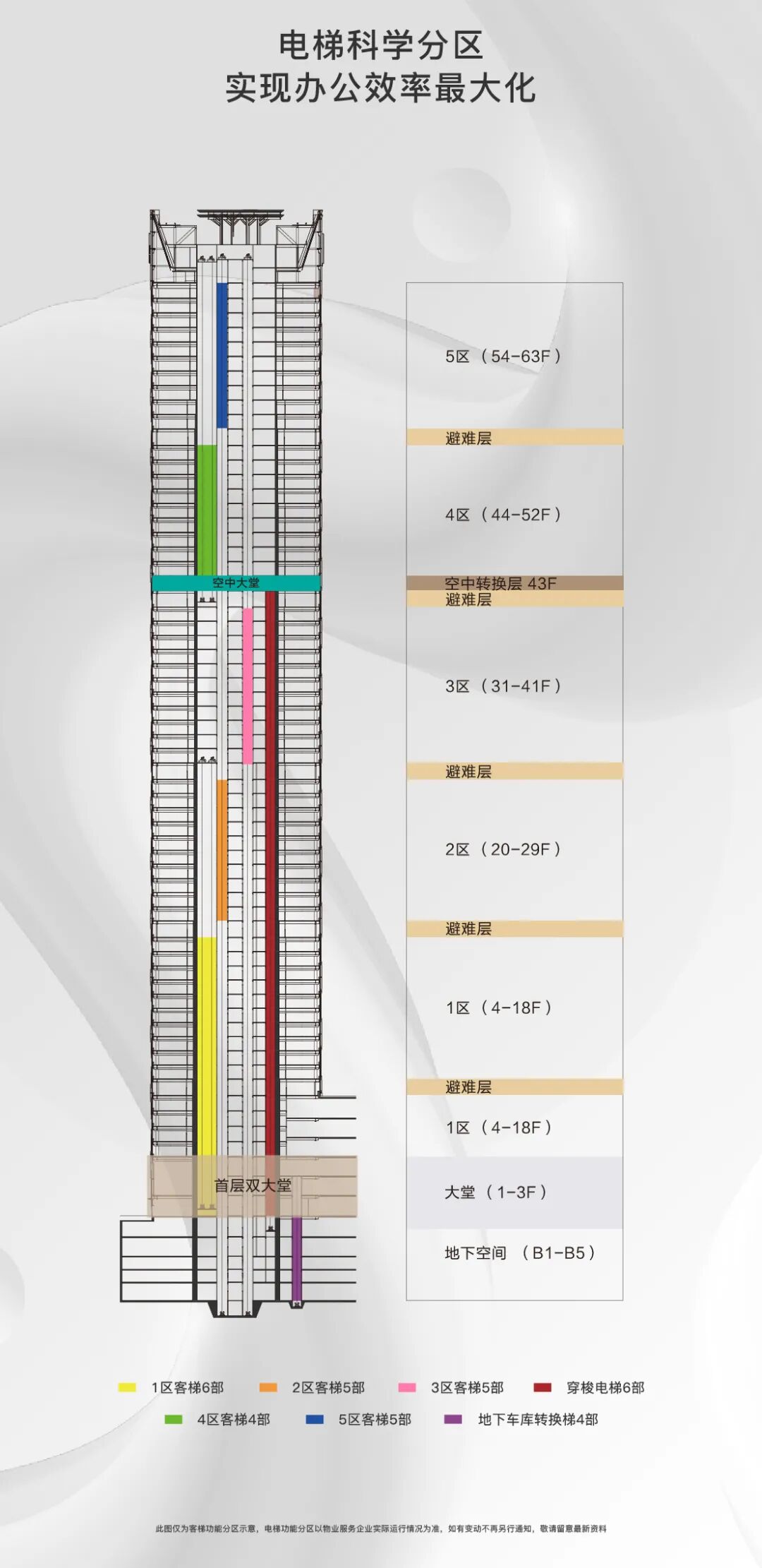 在43层设置空中大堂电梯转换区,33秒即达43层,采取这种空中花园式的电梯转换大堂,可以有效减少电梯穿越的这些无关楼层的电梯井的井道面积和井道体积,实现人群快速分流,提高使用率。