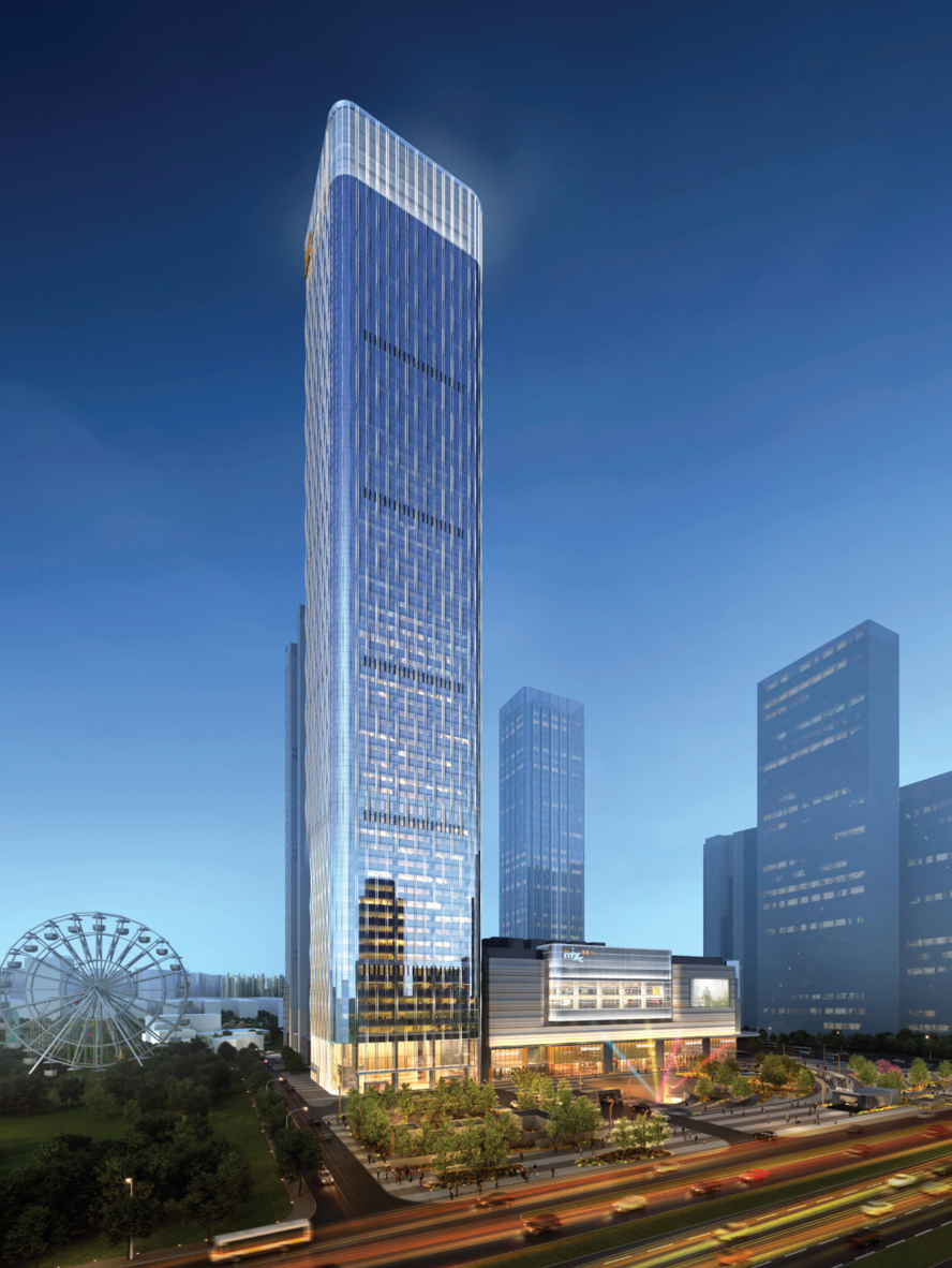 塔楼整体外观设计呼应规整的建筑与空间形态,采用经典的三段式布局,底部端庄大气,中部晶莹通透,顶部时尚简洁,是接轨世界前沿审美的时尚建筑。