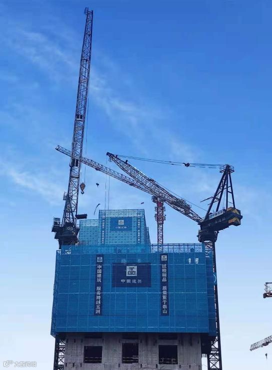 中建三局对超高层建设拥有超强的经验与实力,写字楼核心筒采用液压爬模集成体系施工,与核心筒外挂两台QTZ750动臂塔形成整体“造楼机”,中建三局突破多项技术难题,解决了爬模和动臂塔安装和顶升的技术问题、超高层泵送布料机和爬模结合的技术问题、爬模预埋件与塔吊预埋件、钢构预埋件和机电洞口的避让技术问题等。