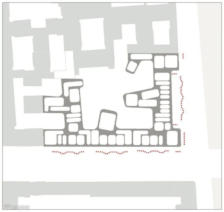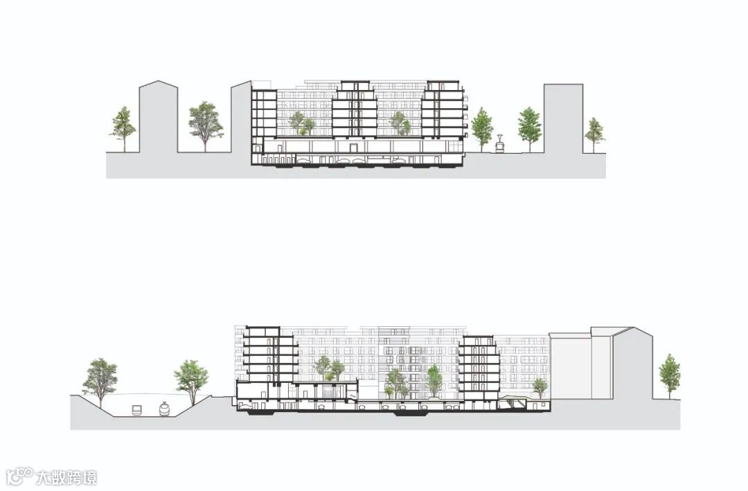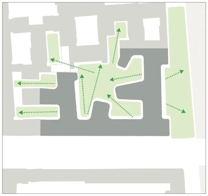 这一流动的重新诠释了典型的威廉敏时期的柏林庭院,其特点是相邻庭院的景观,从而产生了半公共亲密感,新区域的居民可以找到彼此的方式,并像邻居一样生活。